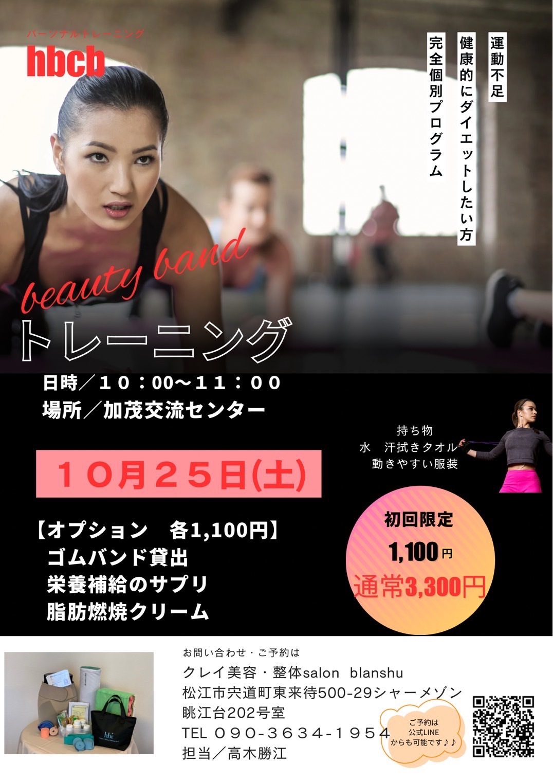 イベント 2025-09-29 完全個別プログラム パーソナルトレーニング クレイ美容・整体 salon blanshu 運動不足健康的にダイエットしたい方に!10月25日加茂交流センターにて開催します! PDFを開く 一覧に戻る