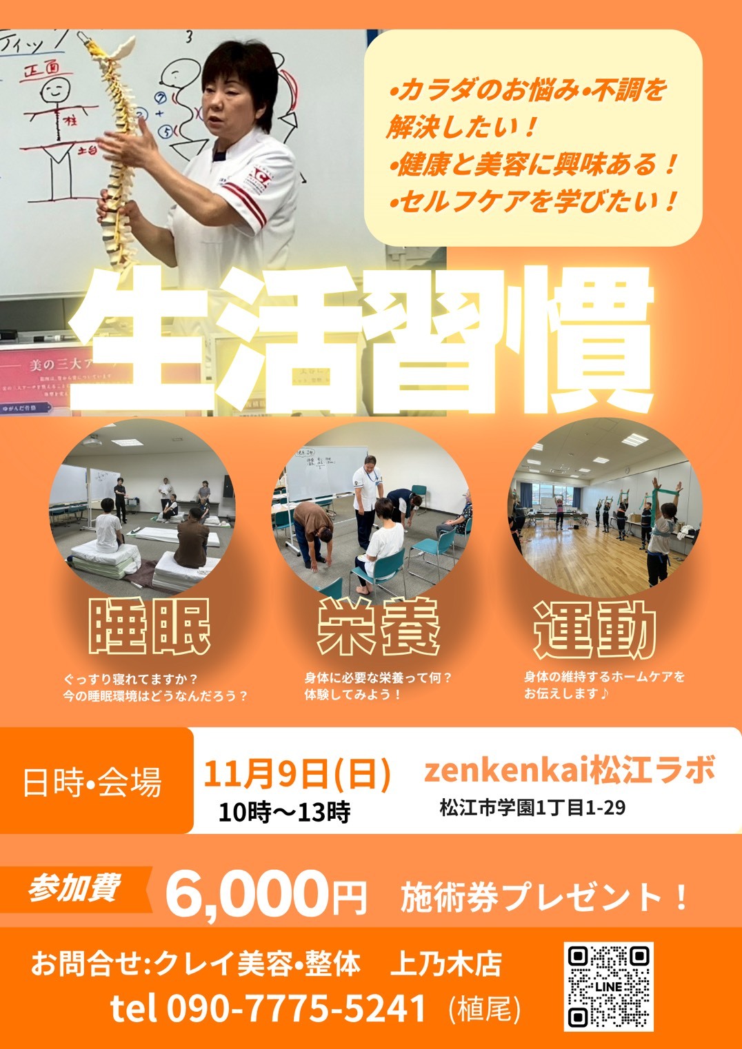 イベント 2025-10-17 生活習慣改善 クレイ美容・整体 上乃木店 11月9日Zenkenkai 松江ラボにて!カラダのお悩みや不調を解決したい。健康と美容に興味がある方。セルフケアを学びたい方はぜひ! PDFを開く 一覧に戻る