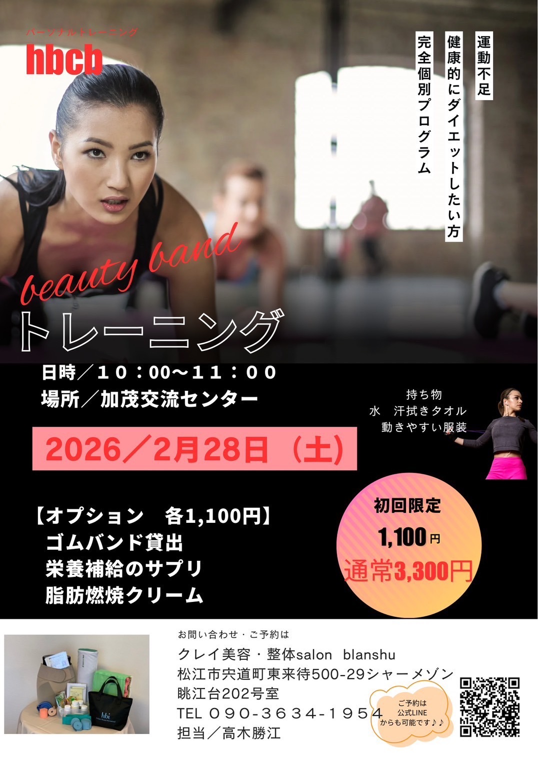 イベント 2026-02-04 完全個別プログラム パーソナルトレーニング クレイ美容・整体 salon blanshu 運動不足健康的にダイエットしたい方に!2月28日加茂交流センターにて開催します! PDFを開く 一覧に戻る
