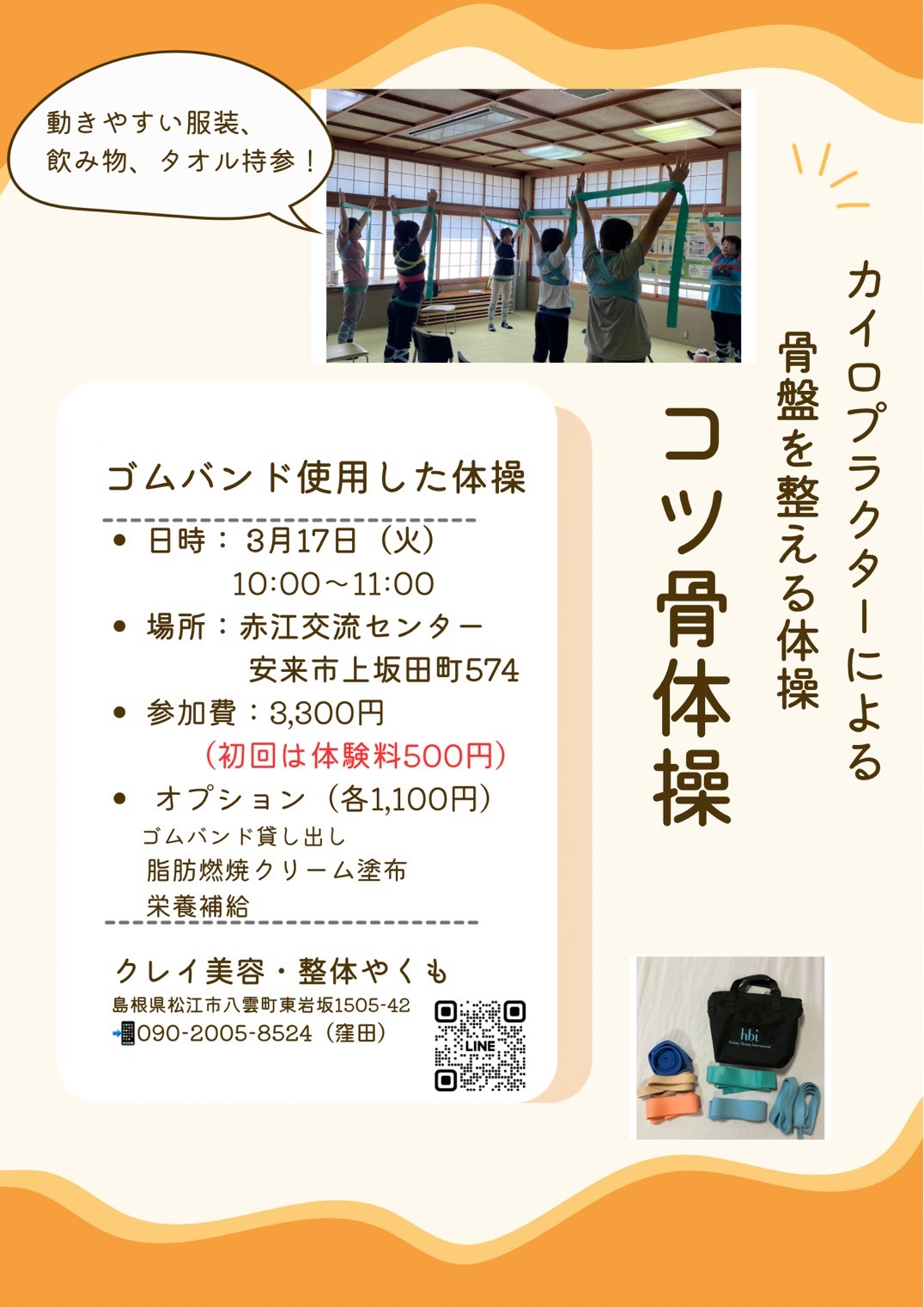 イベント 2026-02-19 コツ骨体操 クレイ美容・整体 やくも 赤江交流センター カイロプラクターによる、ゴムバンドを使用した骨盤整え体操3月17日赤江交流センターにて開催します! PDFを開く 一覧に戻る