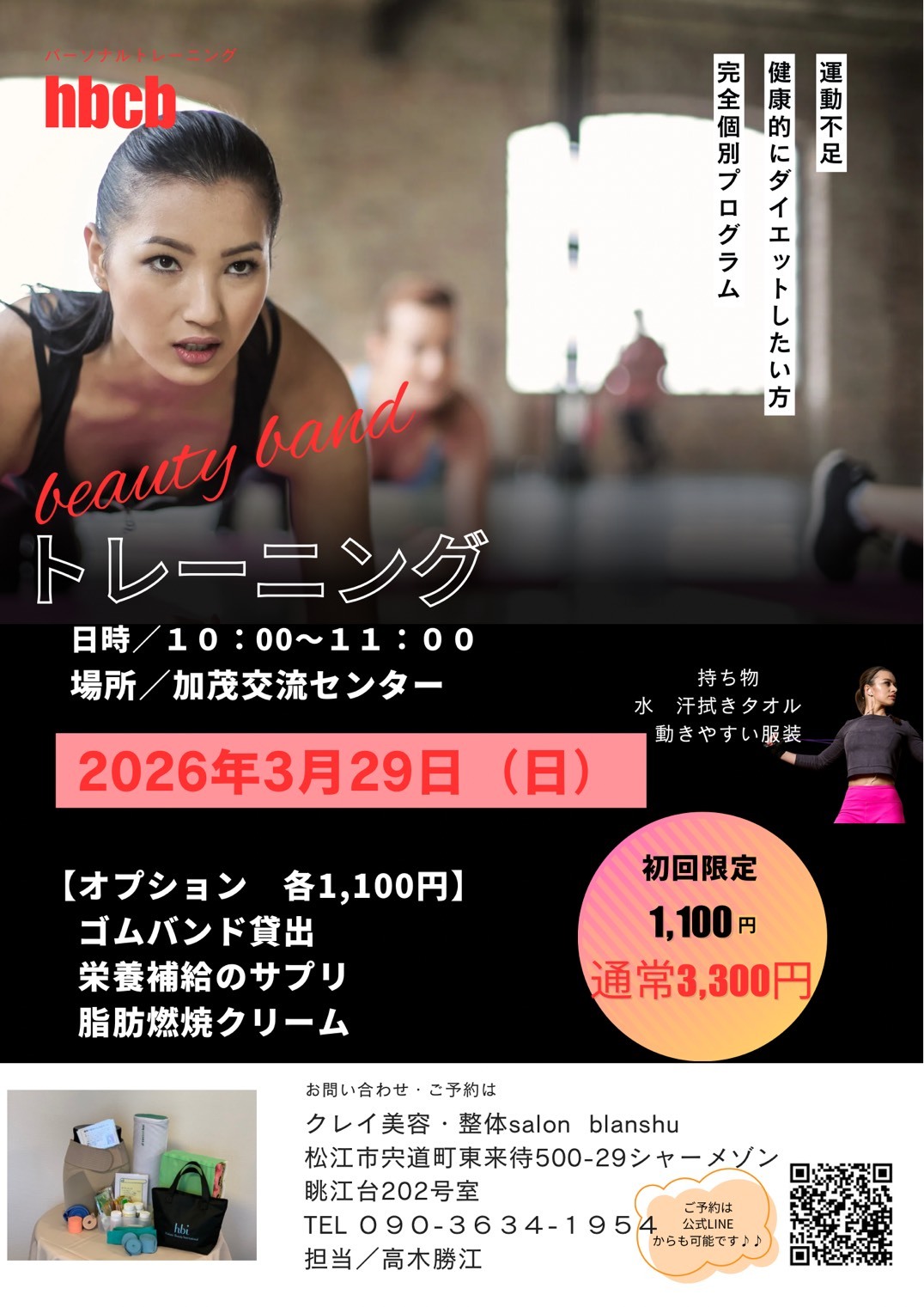 イベント 2026-02-21 完全個別プログラム パーソナルトレーニング クレイ美容・整体 salon blanshu 運動不足健康的にダイエットしたい方に!3月29日加茂交流センターにて開催します! PDFを開く 一覧に戻る