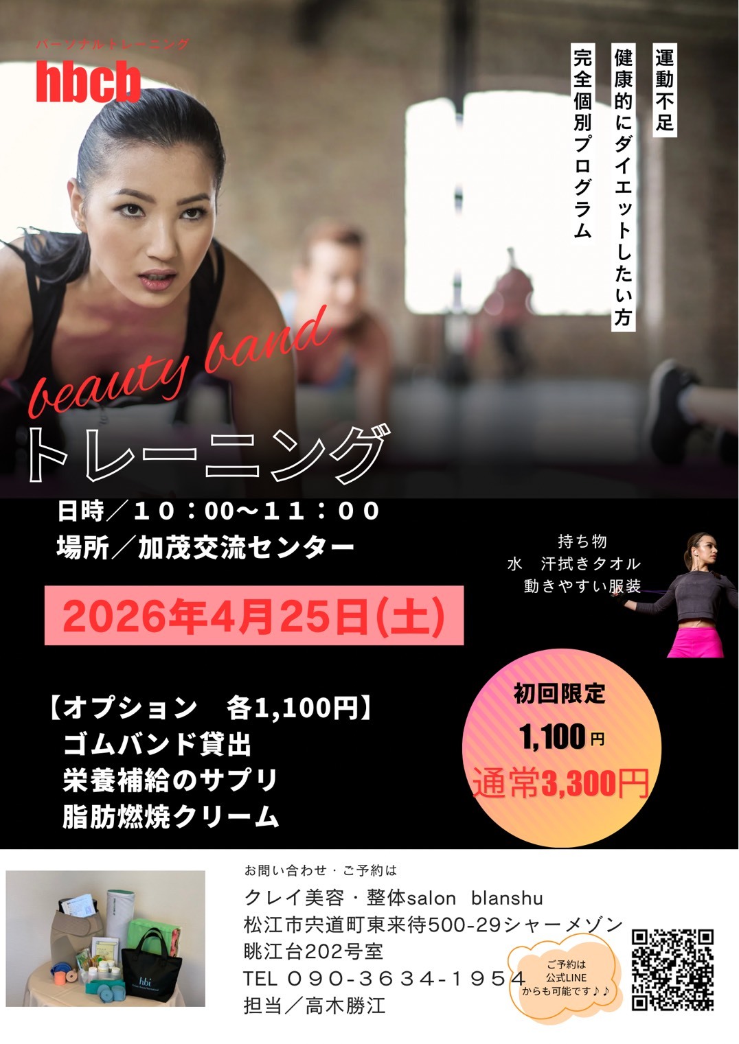 イベント 2026-03-19 完全個別プログラム パーソナルトレーニング クレイ美容・整体 salon blanshu 運動不足健康的にダイエットしたい方に!4月25日加茂交流センターにて開催します! PDFを開く 一覧に戻る